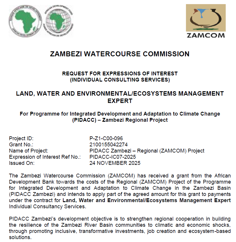 For complete EOI - Multinational - Land and Water Expert Consultancy - PIDACC Zambezi, DOWNLOAD HERE: